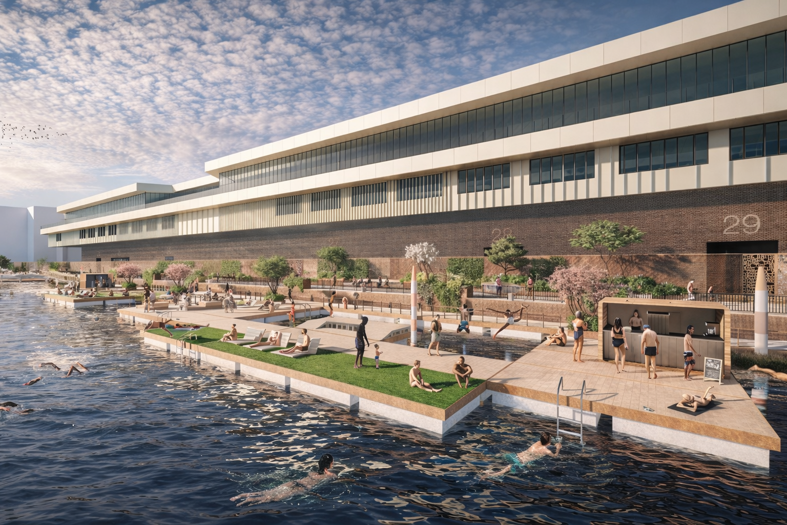 Rooted in the dockland’s industrial and maritime heritage, the landscape adopts a modular design language that supports changing cultural, recreational, and ecological programmes. A kit-of-parts framework—featuring reconfigurable furniture, planters, and public space elements—enables the public realm to adapt over time, supporting future flexibility and ongoing activation.
