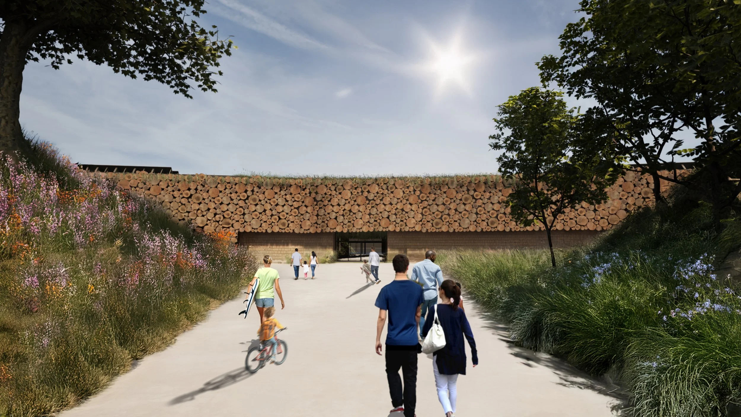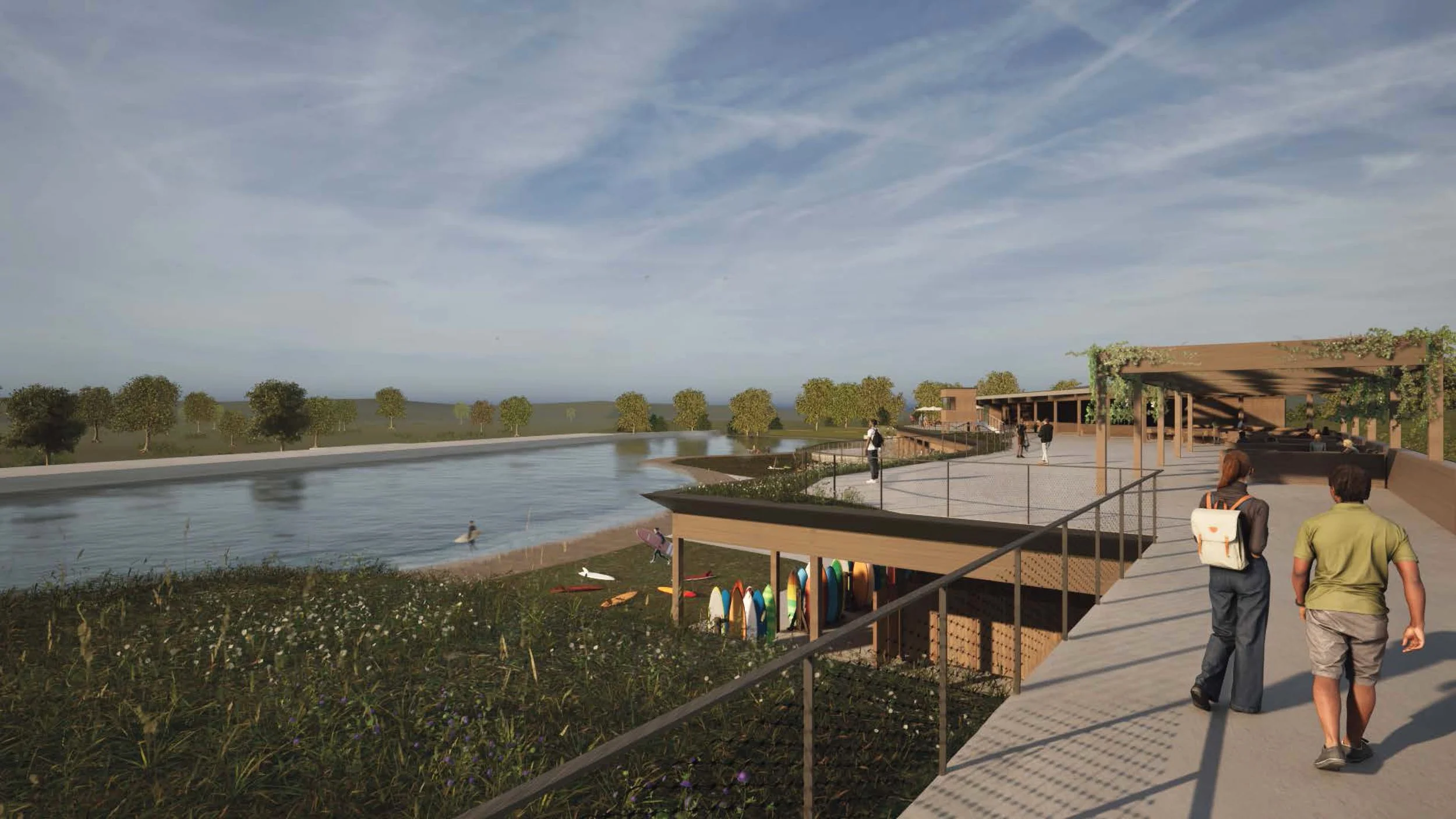 At its centre is a world-class inland surf lagoon powered by Endless Surf technology, surrounded by a landscape-led experience of biodiverse parklands, lakeside terraces, woodland trails, and sensory play. A new public park and activity zone—including skate and pump tracks, sports courts, and outdoor fitness—extend the site's benefit to the wider community, promoting active lifestyles and equitable access to green space.