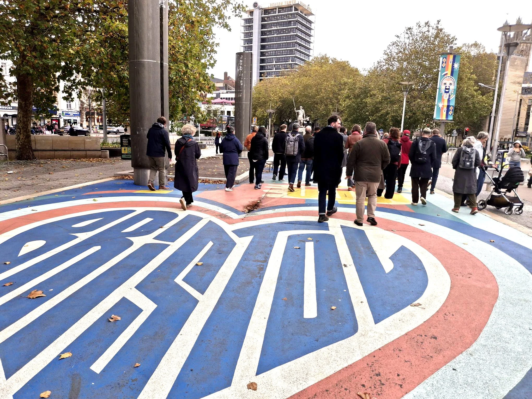 Nearby at Centre Promenade, this reflective stance turns into proposition. Artist Oshii’s Our Common Ground, a floor-based artwork commissioned by Bristol City Council and Bristol City Centre BID and curated by the Bristol Legacy Foundation, sits within a wider reparative framework. Introduced by Tabitha Clayson from the Council’s Arts Development team, the project responds to initiatives such as Project T.R.U.T.H and the Colston What Next? process.